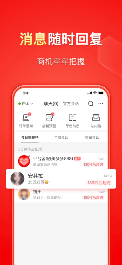 拼多多商家版最新版是一款为广大商户和商户提供的移动开店管理平台,让所有的商户都能在这个平台上进行简单的运营,实现一步一步的运营,省去了很多的时间和精力。拥有良好的浏览轨迹记录,查询订单服务,即时通讯等多种能力,让你的店面运营更加顺畅。