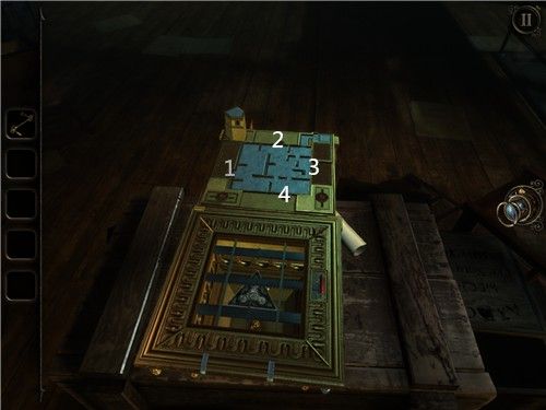 将箱子右侧滑板拉至右边,通过透视镜可以看到一些碎积木,将其拼好,浮现十字插口。将转轴钥匙插入,转动。
