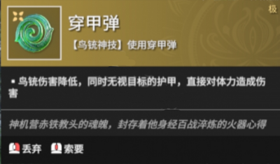1、穿甲弹,穿甲弹是鸟铳的金色品质的魂玉,穿戴穿甲弹之后,鸟铳伤害会降低,但是会直接无视敌人护甲对体力造成伤害,基础效果是增加攻击力。