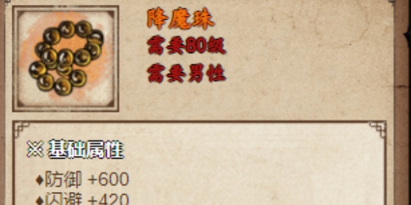 1、降魔珠是一串80级且限定男性使用的挂件,装备后可以增加600的防御力和420的闪避值。