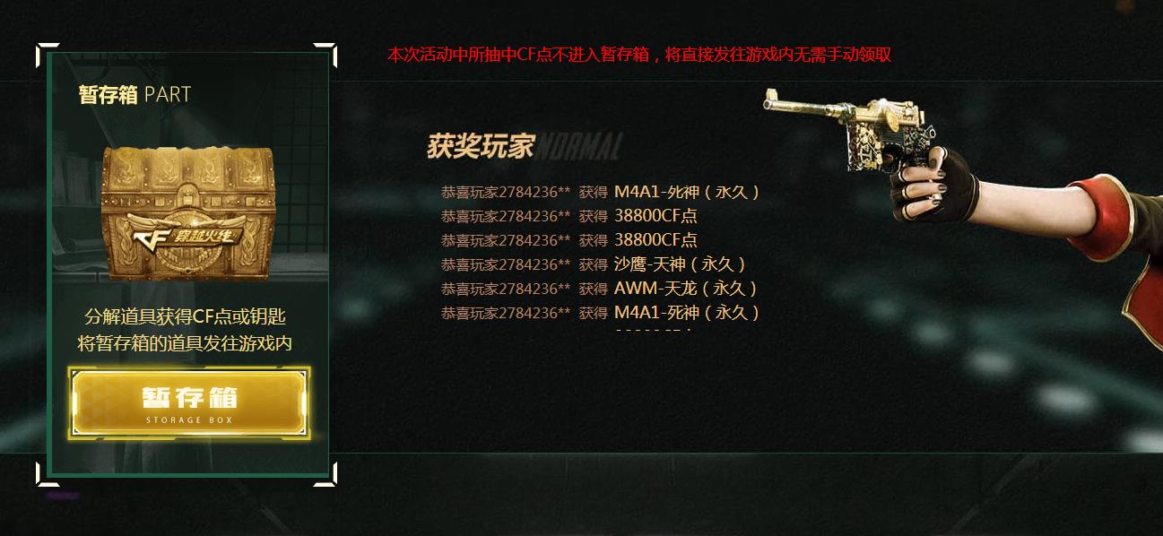 2、可以使用钥匙打开百宝箱1次或10次,打开后获得的道具存放在【暂存箱】中,部分道具可选择分解成钥匙或CF点或发往游戏仓库,已经领取到仓库的道具无法退换,请慎重(在参与活动期间请确认好绑定的大区);不可分解的道具将直接发往游戏内,不进入暂存箱;