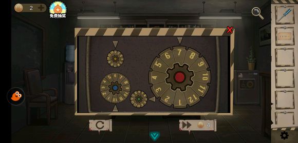 用铁丝激活狱长室右边墙角保险柜的齿轮(图1),根据那张颜色数字纸的提示(图2),把四个齿轮调整到相应的数字,打开保险柜拿到印加古城图纸(图3)和一大串钥匙以及U盘(图4)。