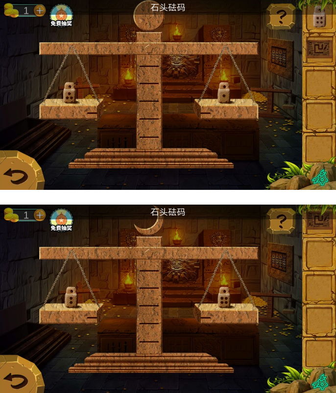 1.左下角汉诺塔样的机关,左下角拿砝码,将珠子移动到颜色对应的柱子上去,这个不难只要有一直移到相同颜色的意识就行