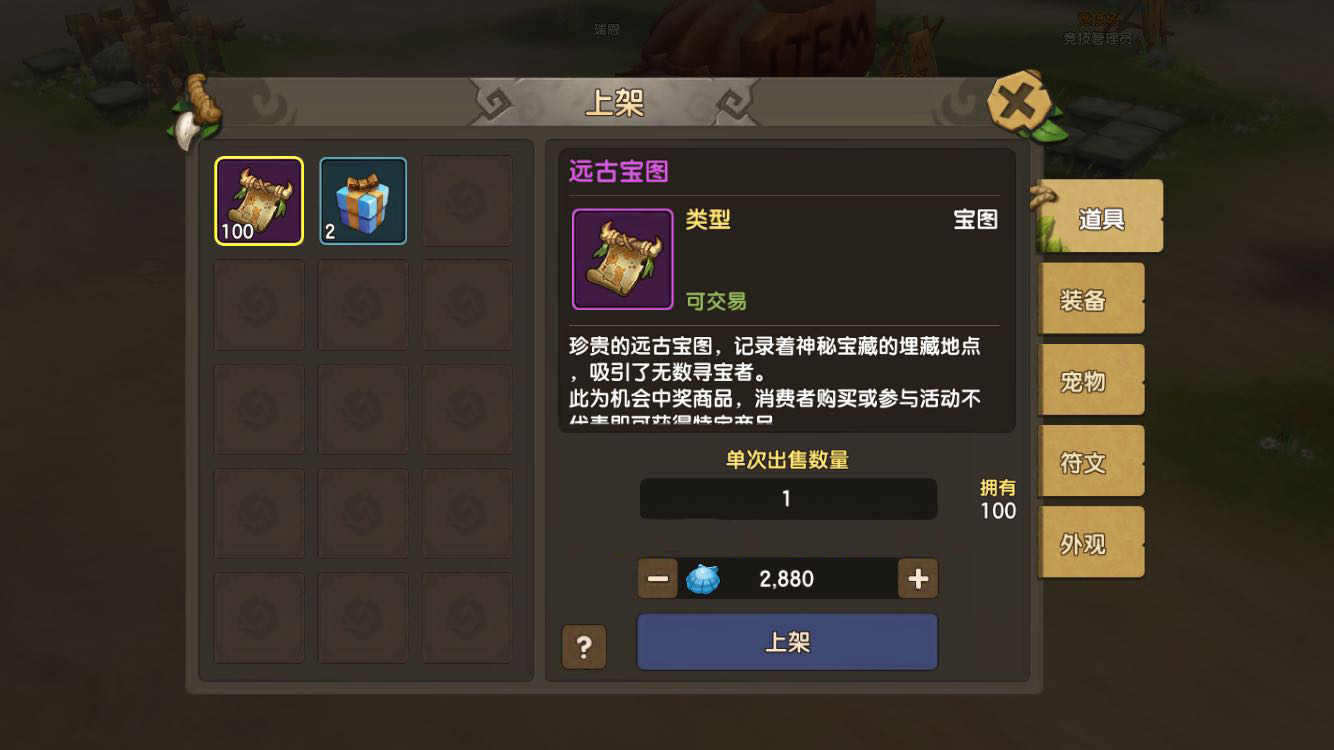 玩家对富裕的宠物、极品道具或非极品道具中可以选择出售,进入相应的出售界面即可安排道具上架。