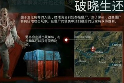 在该模式的地图上充满了武器,这是一个60人局的对战的模式。开局5分钟之内天还是蒙蒙亮的,在此期间大家可以收集武器寻找资源,找到载具前往指定的安全区集合;当黑夜来临之后就会出现很多丧尸,同时在红色圈内会有丧尸BOSS,击杀之后会有海量高级资源,专门击杀丧尸可以使用。这些僵尸在黑夜中冒着黄光,遇到玩家就会变得非常疯狂,至死方休。而僵尸还分等级,普通僵尸可以轻松解决。屠夫僵尸体型巨大,血量很高,还有跑步冲刺的能力,但只是近战单位,拉开距离就能轻松解决。还有一种过毒液僵尸,如果发现建议第一时间击毙,因为它喷出的毒液不好躲避。