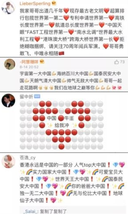 各家粉丝于是团结起来,一起维护阿中,用特有的饭圈文化,有组织有纪律战斗力爆表地怒怼"港独"言论,一夜之间占领各大社交媒体。
