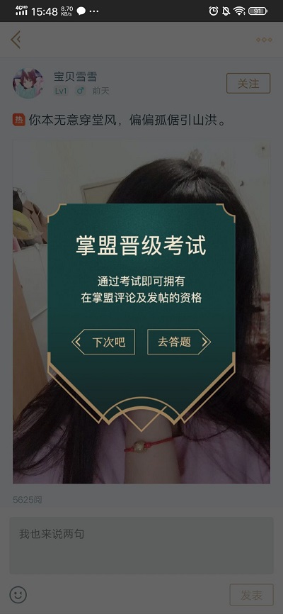 2、进入萌友圈随便点击一个话题,点击发表评论,当玩家点击发表评论的时候就会弹出需要玩家进行晋级考试的提示;