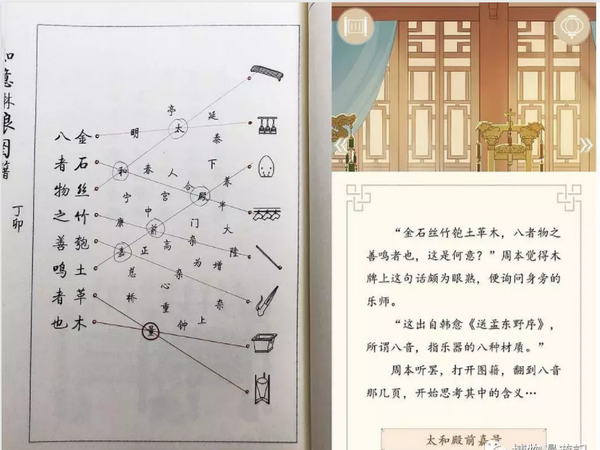 点击上图中不同乐器可听到声音,根据书中对乐器的介绍,按乐器材质连线可得到答案“太和殿前嘉量”。